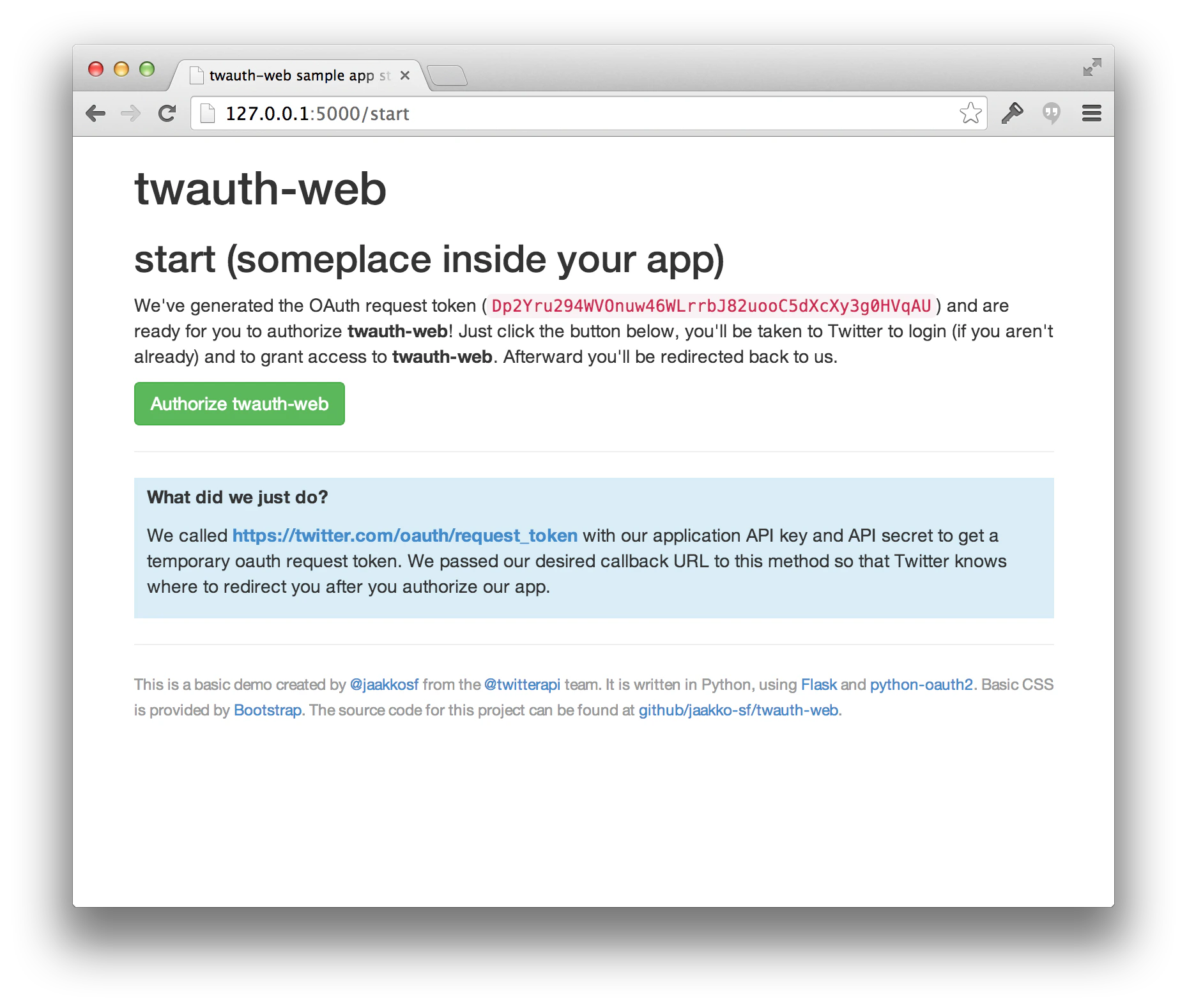 The standard flow is web-based and uses the 3-legged authorization OAuth flow. The screenshots outlined here are part of a sample that you can view the source of at https://github.com/xdevplatform/twauth-web. At some point in your application, you will want to redirect to X in order to authorize your application.