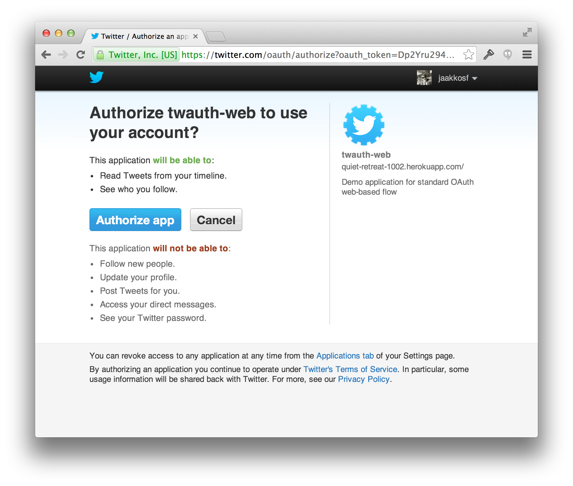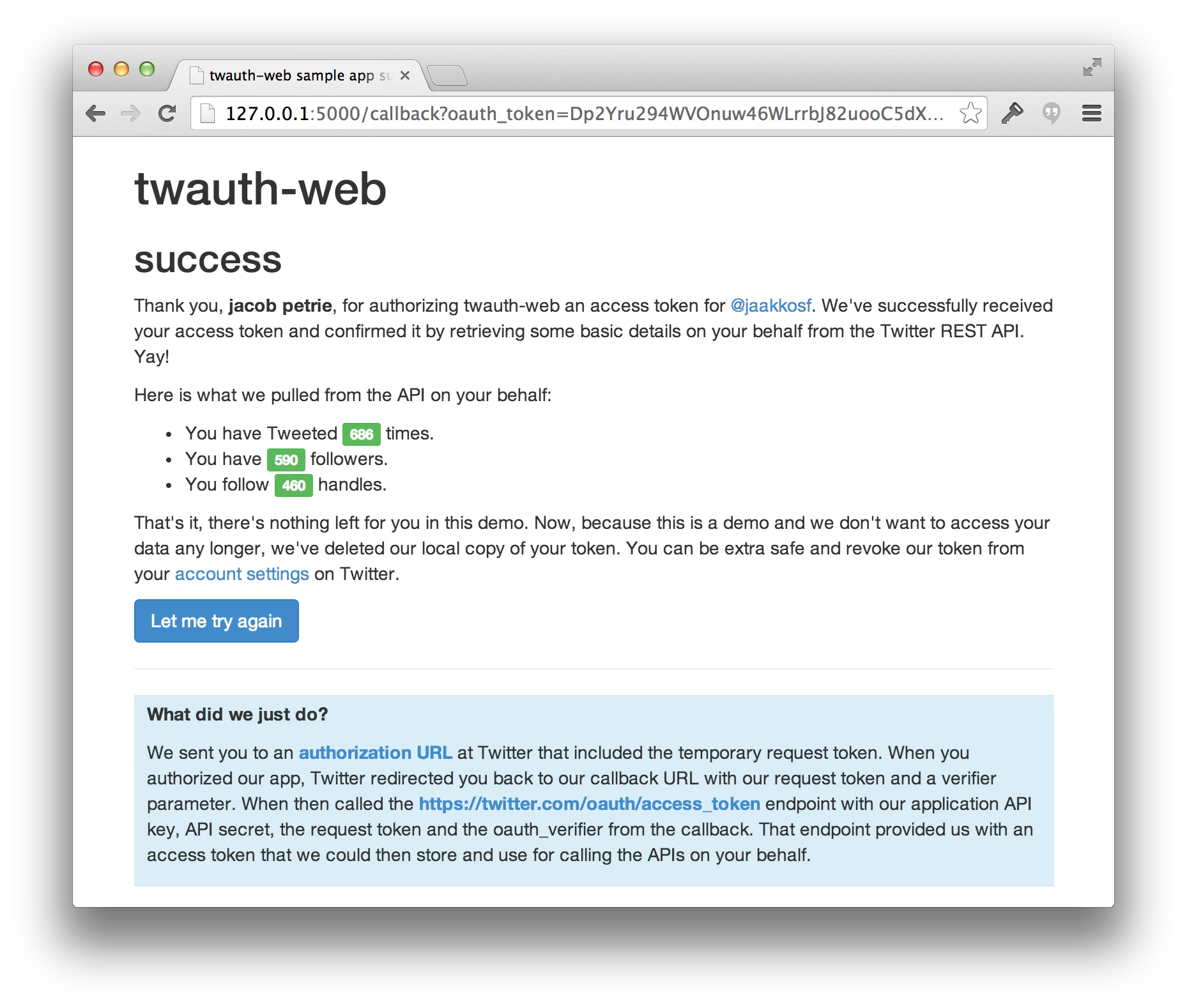 Upon authorizing your application, the user will be redirected to the callback URL provided when you generated the request token. You will use this to obtain the permanent access token for this user and store it locally.